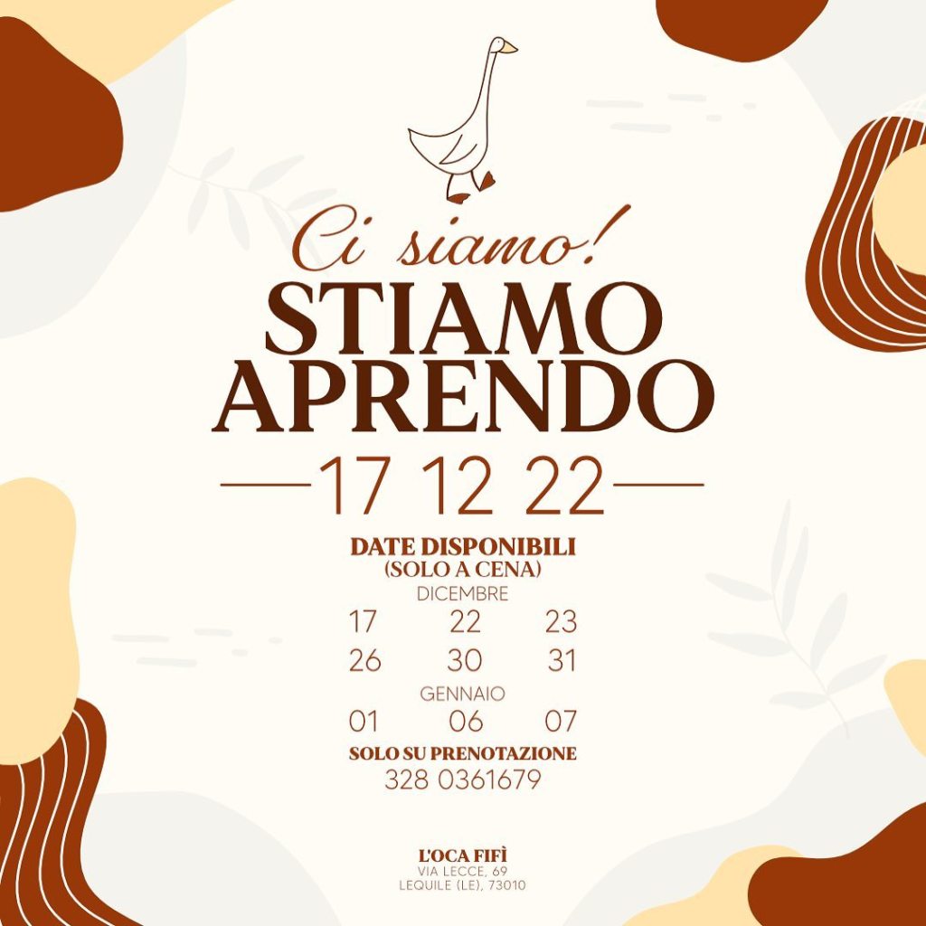 Da dicembre 2022 ha realizzato il suo sogno! Aprire un proprio ristorante. Alle porte di Lecce ha aperto il ristorante “L’Oca Fifì”, dove Annamaria accoglie i suoi clienti in una atmosfera casalinga. La sua proposta è una cucina di “casa” a km 0.
